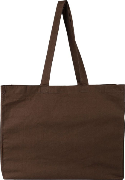 Katoen (18 g/m²) boodschappentas in D-vorm met een bodemvouw van 13 cm. Afmeting 43 × 34 cm. Lange hengsels (67 cm lang, 3 cm breed). Dit product is OEKO-TEX® STANDAARD 100 gecertificeerd.