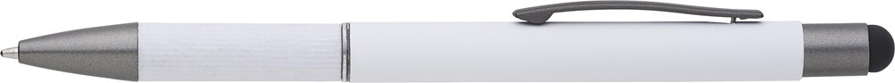 Aluminium balpen met gerold papier details op de grip. Rubberen tip voor capacitieve schermen. Blauwe inkt.