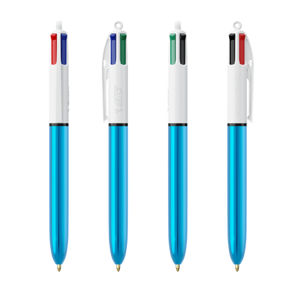 Le célèbre BIC® 4 Couleurs®, icône de la marque, présenté dans des couleurs métallisées brillantes. Disponible dans 4 couleurs d'encre standard : bleu, noir, rouge et vert. Notre emblématique BIC® 4 Couleurs® devient plus durable, avec désormais 13 % de plastique en moins dans la partie supérieure !
