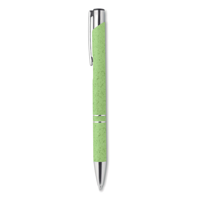 Stylo bille à bouton poussoir en 50% paille de blé et 50% ABS avec armatures en argent. Encre bleue.