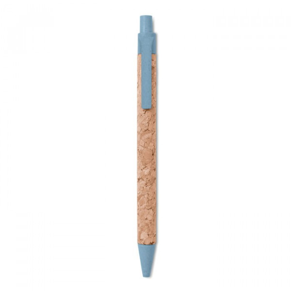 Stylo bille poussoir avec corps en liège et paille de blé (50%) et plastique ABS (50%). Encre bleue. Le liège est un matériau naturel, en raison de sa nature structurelle et de sa porosité de surface, le résultat d'impression final par article peut présenter des écarts.