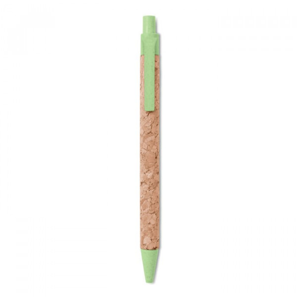 Stylo bille poussoir avec corps en liège et paille de blé (50%) et plastique ABS (50%). Encre bleue. Le liège est un matériau naturel, en raison de sa nature structurelle et de sa porosité de surface, le résultat d'impression final par article peut présenter des écarts.