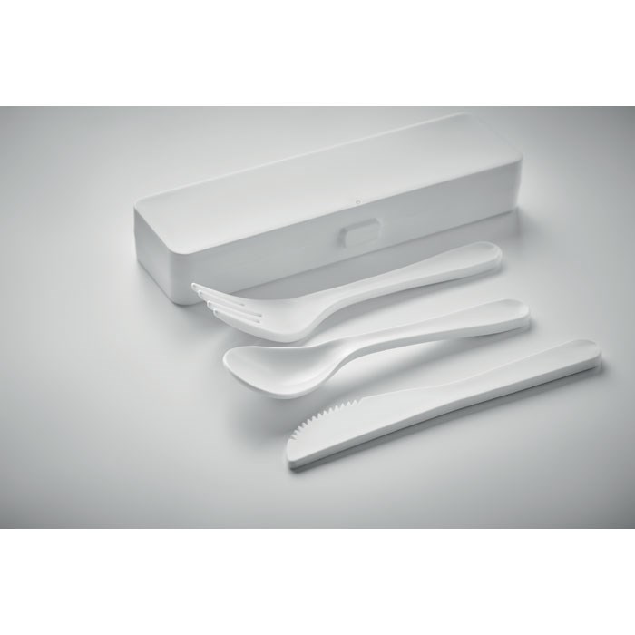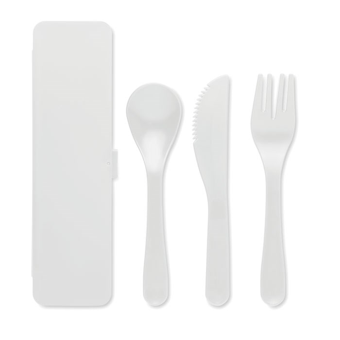 Set de couverts portable réutilisable en PP et étui. Comprend une cuillère, une fourchette et un couteau.