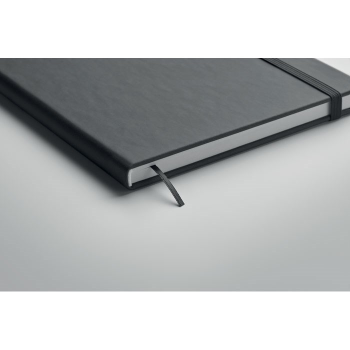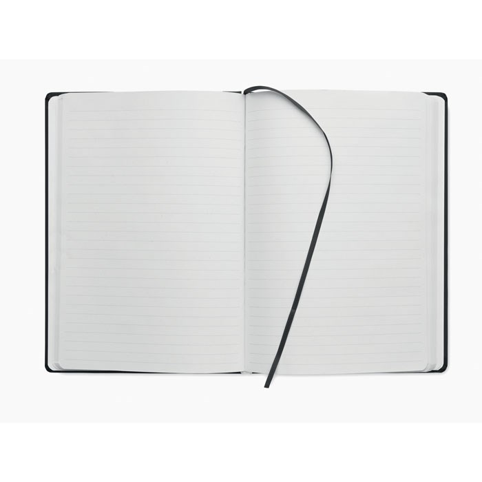 Carnet A5 avec couverture rigide en PU. 200 pages lignées (100 feuilles) en papier recyclé (80 g/m²). Bande de fermeture élastique et ruban marque-page assortis. Fabriqué dans l'UE.