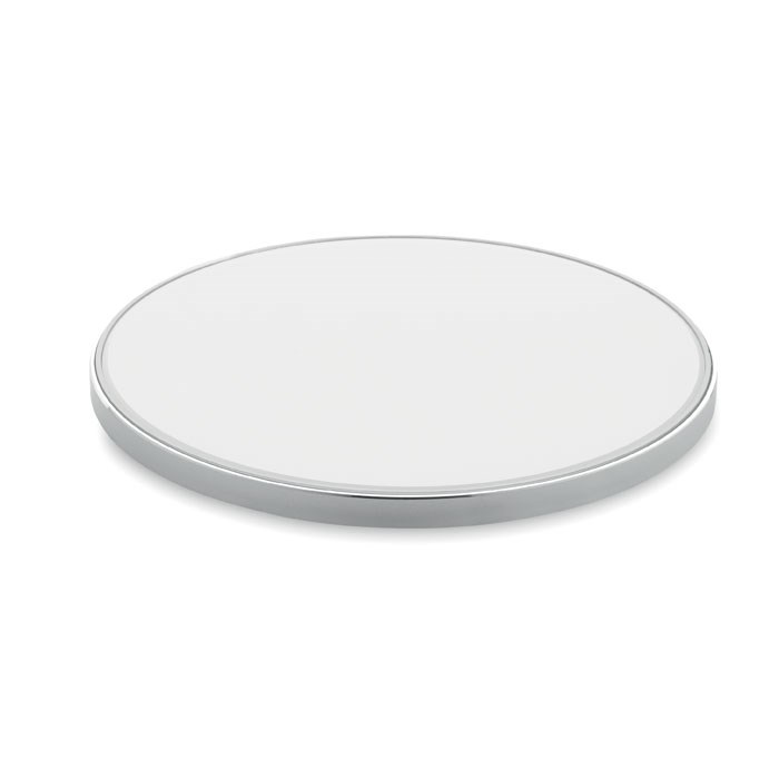 Chargeur sans fil en aluminium 10W avec verre sur le dessus. Lumière bleue lors de la charge. Sortie : DC 9V/1.1A.
