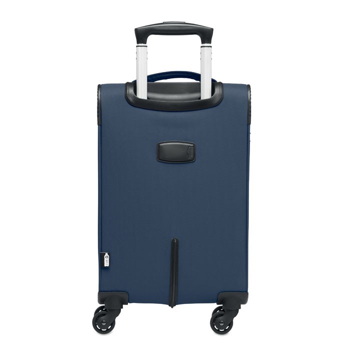 Valise cabine trolley en polyester RPET 600D. Comprenant un compartiment extérieur zippé pour ordinateur portable. Poche frontale zippée. Serrure à c combinaison. Compartiment inférieur avec rubans.