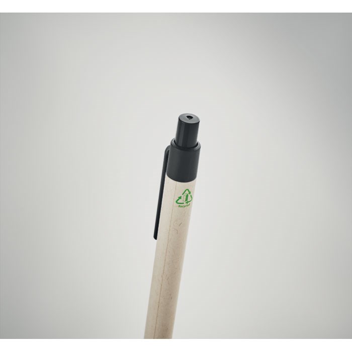 Stylo à bille à bouton poussoir avec corps en 70% de carton de lait recyclé et 30% de papier recyclé et attributs en PLA (en maïs 100% biodégradable). Encre bleue.