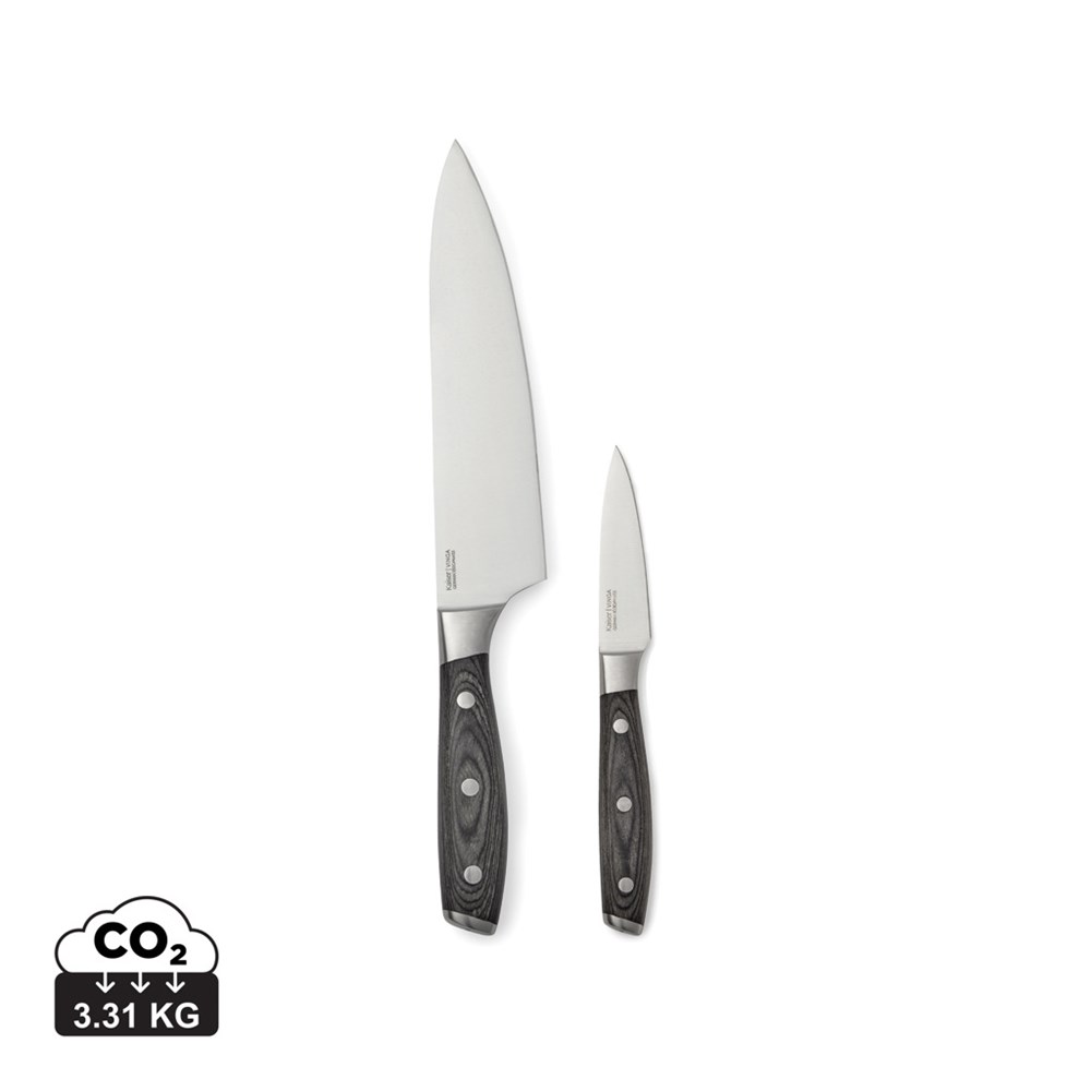 Ensemble composé d'un couteau de chef et d'un économe. Les couteaux sont fabriqués en acier allemand X50CrMoV15 avec un manche en pakkawood. Le manche facile à saisir et le superbe équilibre de la lame rendent le couteau confortable et facile à utiliser. Couteau de chef : Lame de 20 cm. Économe : Lame de 8 cm.