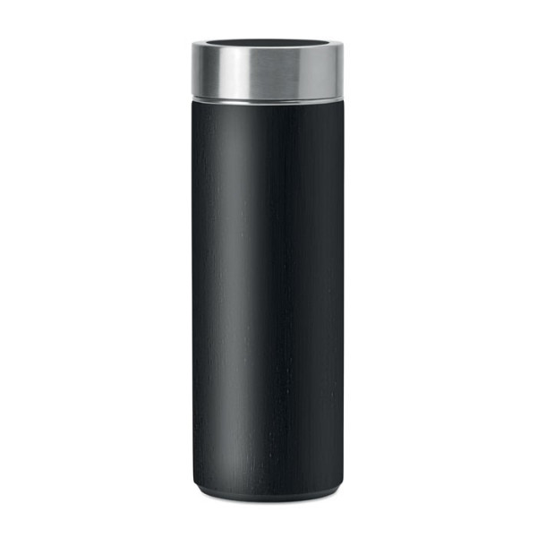 Gourde double paroi Inox avec couvercle isolant en bambou et infuseur à thé. Contenance 400 ml. Le bambou est un produit naturel, et présente de légères variations de couleur, de décoration et de tailles. FSC®-certified | FSC 100%, N5.7, FSC-C213206