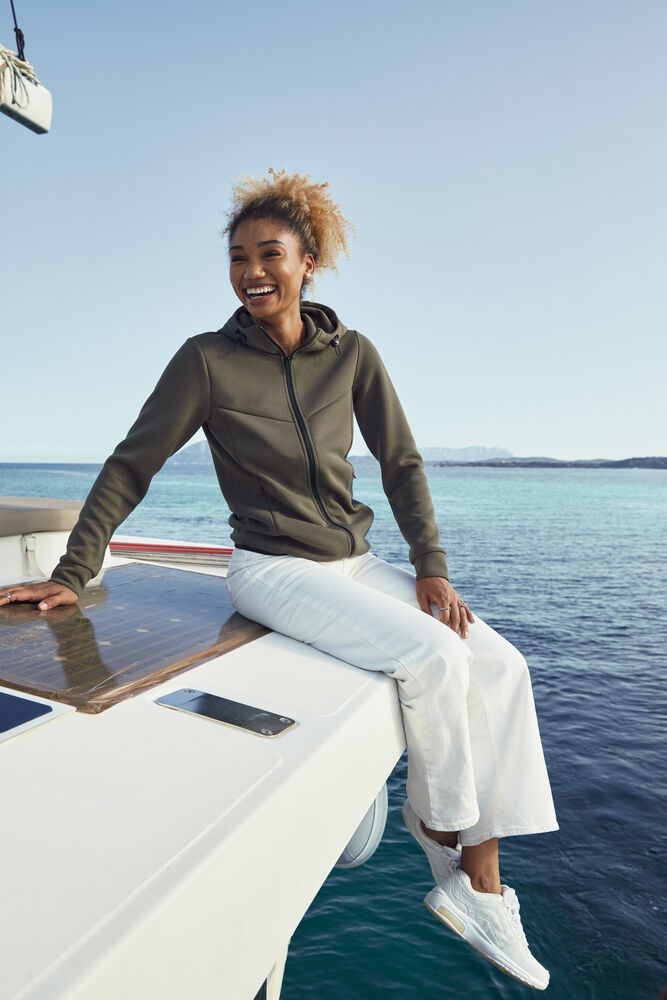 Sweat à capuche - tissu doux au toucher - polyester recyclé - 2 poches latérales cachées zippées - 2 poches intérieures - Poignets en tissu shell - bande élastique à la taille - Cordon de serrage pour une capuche réglable - une étiquette facilement amovible.