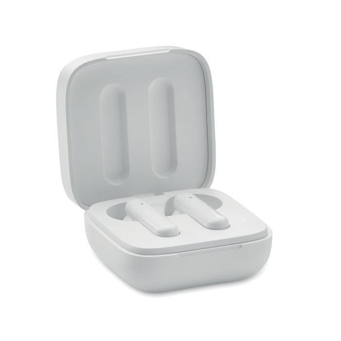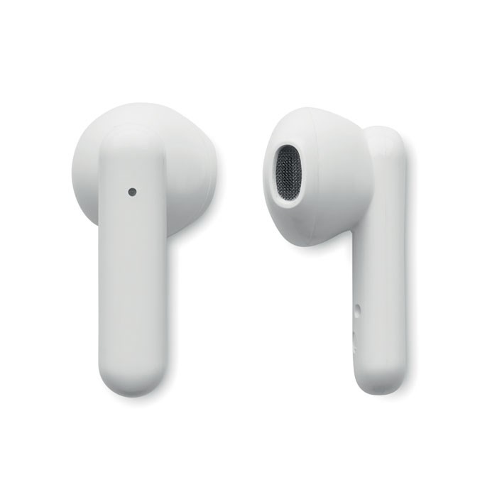 Ecouteurs sans fil ABS True Wireless Stereo (TWS) 5.3 avec microphone et batterie 30 mAh. Durée d'écoute env. 4 h. Batterie à chargement solaire. Appairage automatique. Câble de chargement de type C et chargeur de 200 mAh.