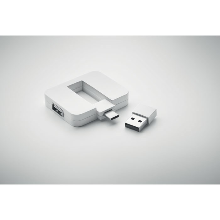 HUB 4 ports USB 2.0 en ABS. Sortie : 2 x Type-A et 2 x Type-C. Entrée : Type-C et Type-A.plus
