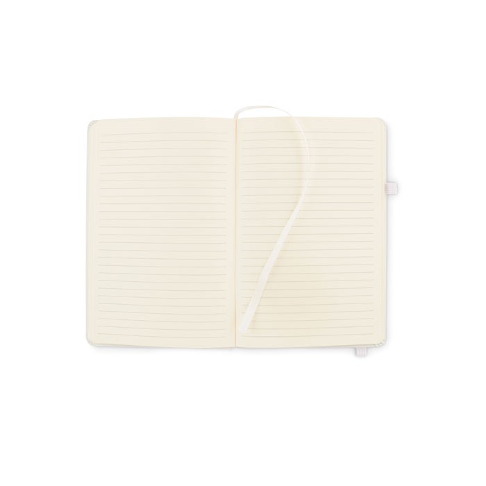 Carnet A5 avec couverture en cuir pré-consommation recyclé à 70 % et en latex PU à 30 %. 192 pages lignées en papier recyclé (96 feuilles). Fermeture élastique en coton et porte-stylo assortis.