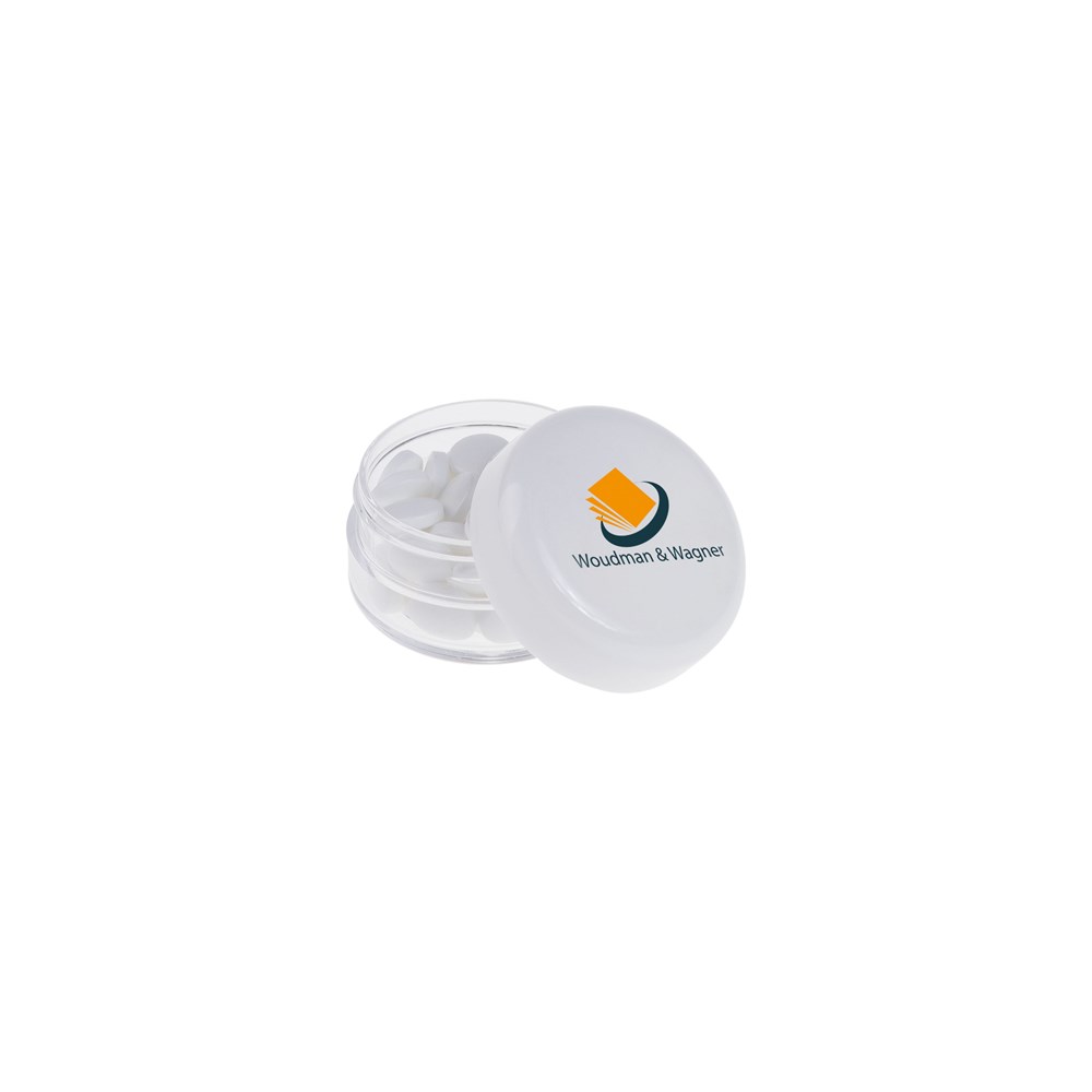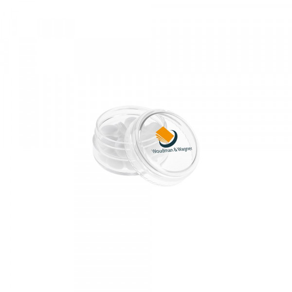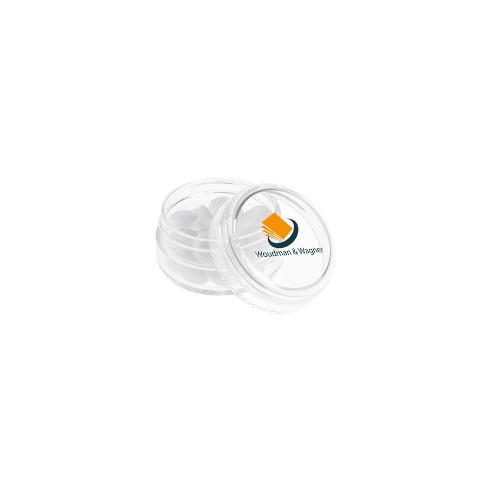 Transparant mini potje met transparant deksel, voorzien van een full colour bedrukking op het deksel en gevuld met ca. 12 gram pepermunt