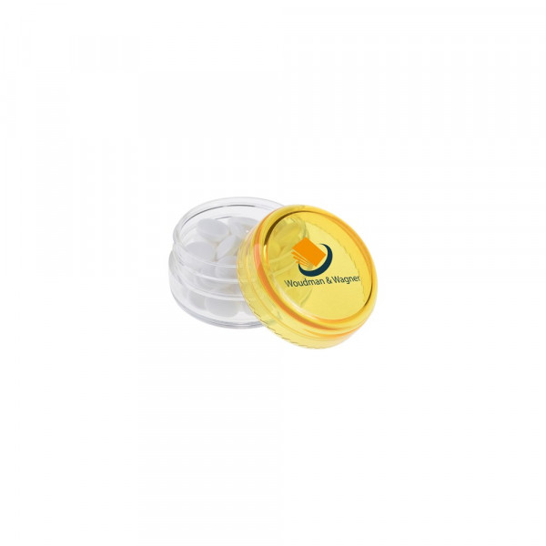 Transparant mini potje met geel deksel, voorzien van een full colour bedrukking op het deksel en gevuld met ca. 12 gram pepermunt