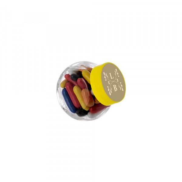 Micro glazen potje 50 ml met geel deksel, voorzien van een full colour sticker op het deksel en gevuld met Dropstaafjes mix