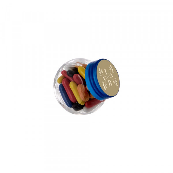 Micro glazen potje 50 ml met blauw deksel, voorzien van een full colour sticker op het deksel en gevuld met Dropstaafjes mix