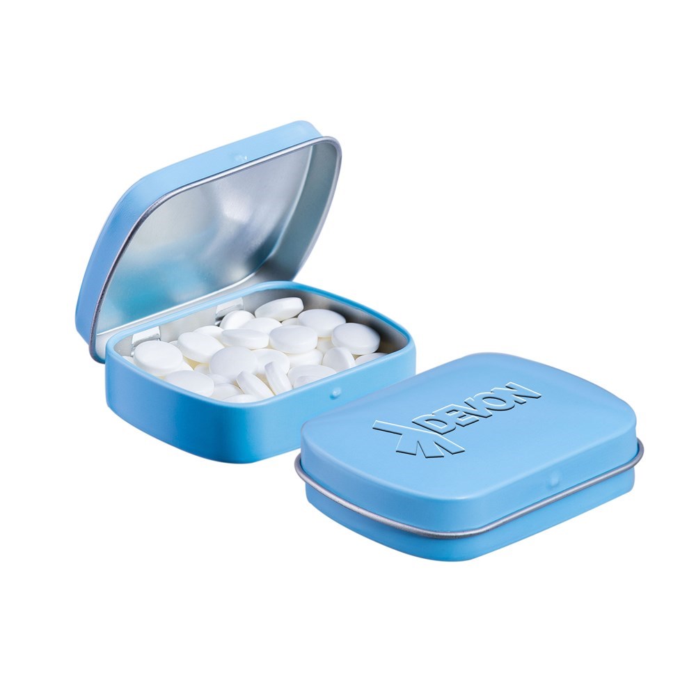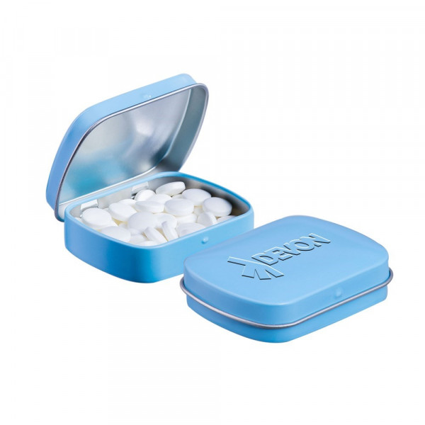 Mini scharnierblikje lichtblauw met ca. 23 gram pepermunt en voorzien van embossing. Inclusief ingrediëntensticker en seal.