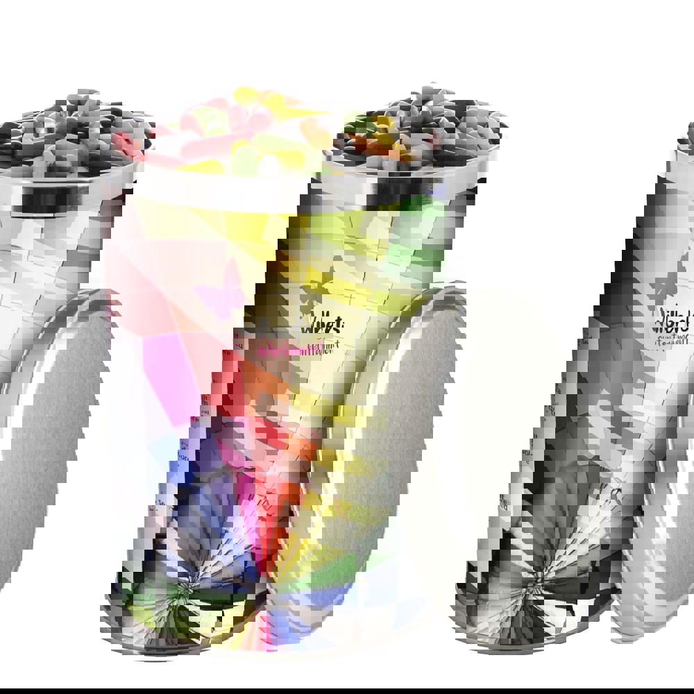 Groot blik 1,3 liter voorzien van een full colour bedrukte sleeve en gevuld met ca. 485 gram...plus