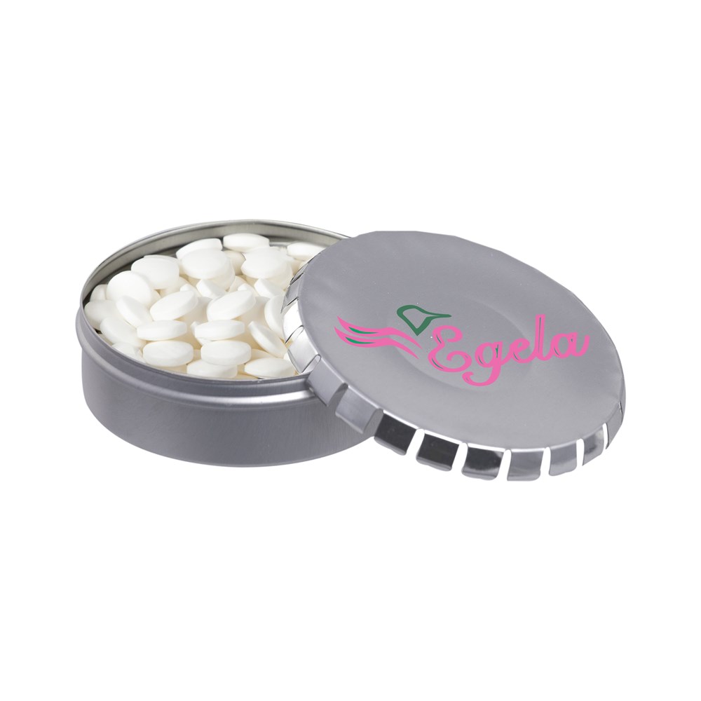 Clic-clac blikje zilver met ca. 50 gram suikervrije pepermunt en voorzien van een full colour bedrukking. Inclusief ingrediëntensticker en seal