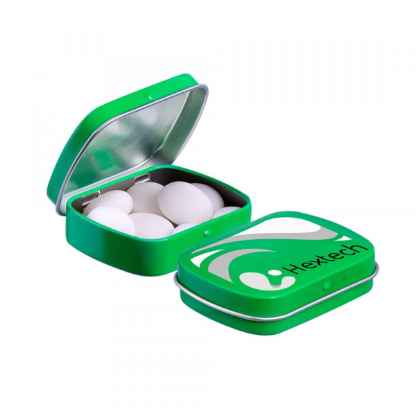 Mini scharnierblikje groen met ca. 28 gram Mentos mints en voorzien van een full colour bedrukking. Inclusief ingrediëntensticker en seal.