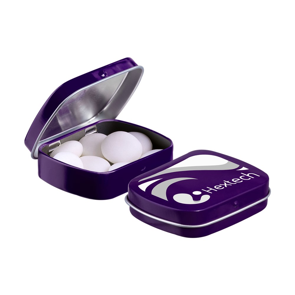Mini scharnierblikje paars met ca. 28 gram Mentos mints en voorzien van een full colour bedrukking. Inclusief ingrediëntensticker en seal.