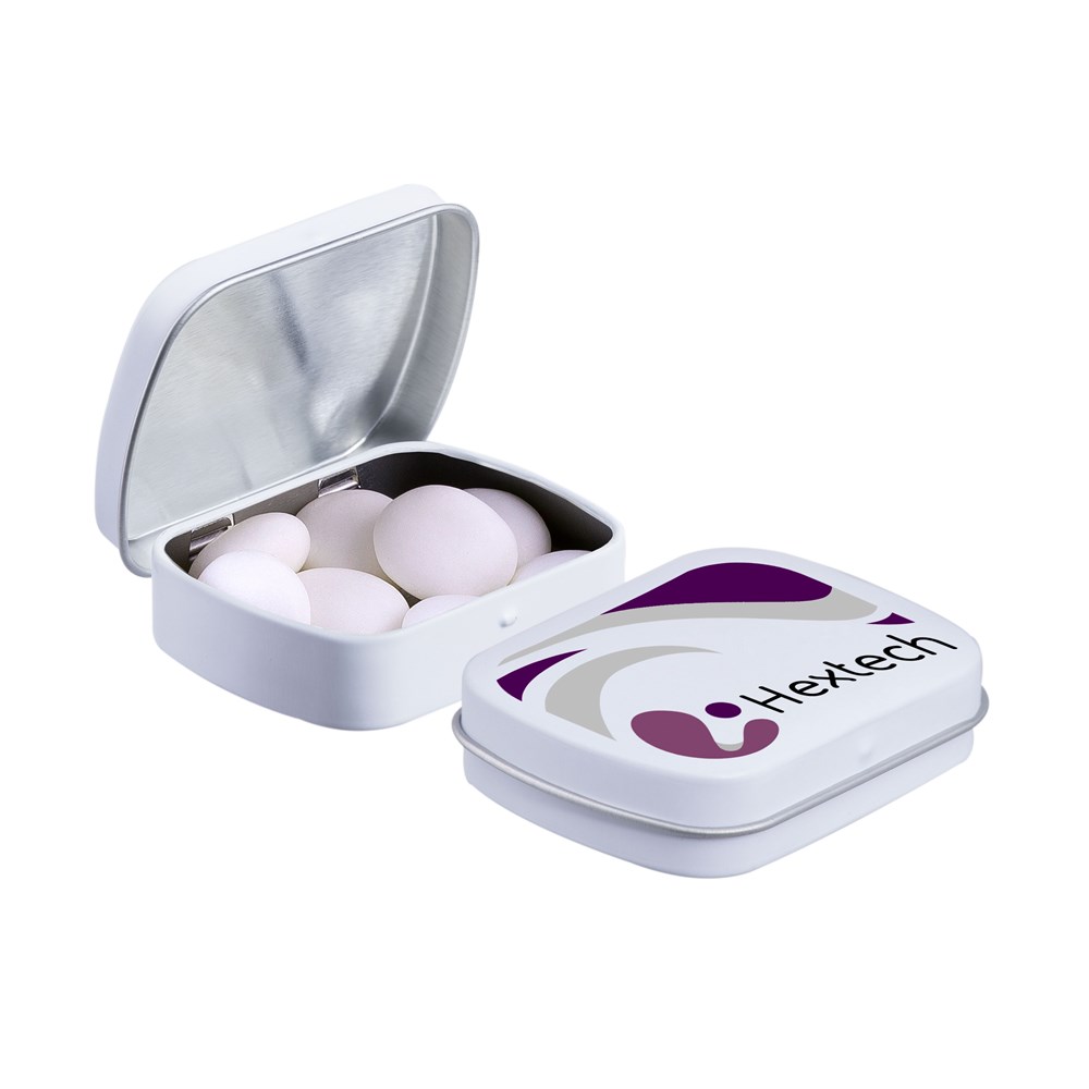 Mini scharnierblikje wit met ca. 28 gram Mentos mints en voorzien van een full colour bedrukking. Inclusief ingrediëntensticker en seal.