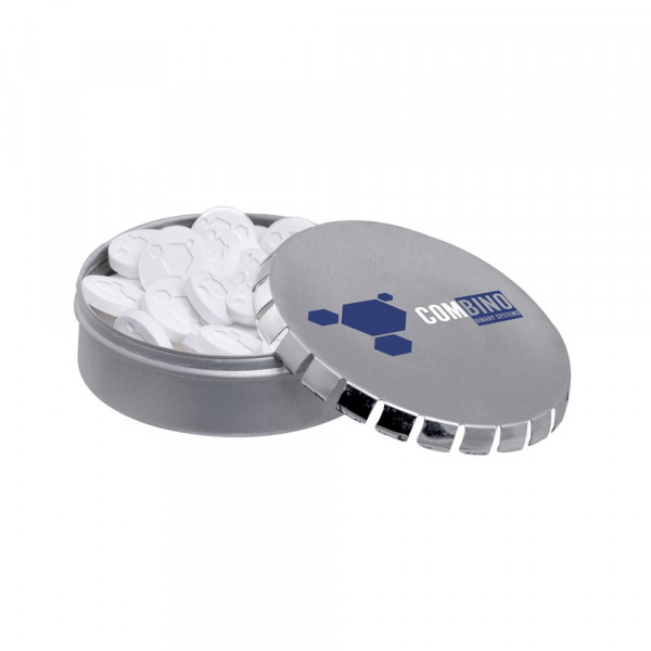 Clic-clac blikje zilver met ca. 50 gram logo pepermunt en voorzien van een full colour bedrukking. Inclusief ingrediëntensticker en seal.