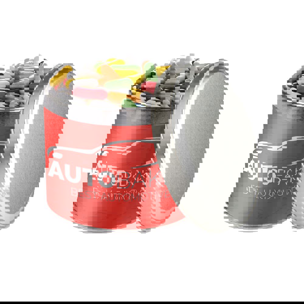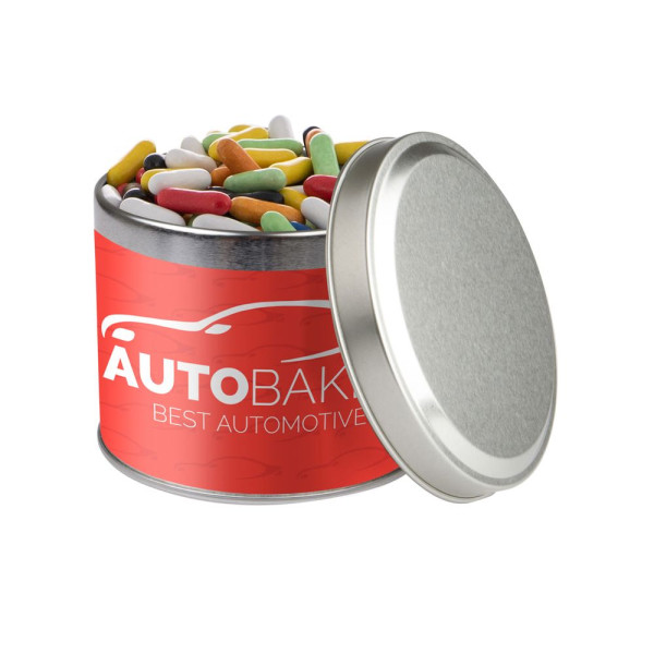 Rond 0,6 liter blik gevuld met ca. 475 gram Dropstaafjes mix en voorzien van een full colour bedrukte, rondom geplakte sticker