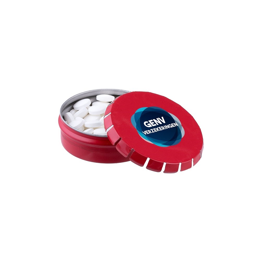 Mini clic-clac blikje rood met ca. 23 gram pepermunt, voorzien van een full colour bedrukking. Inclusief ingrediëntensticker en seal.