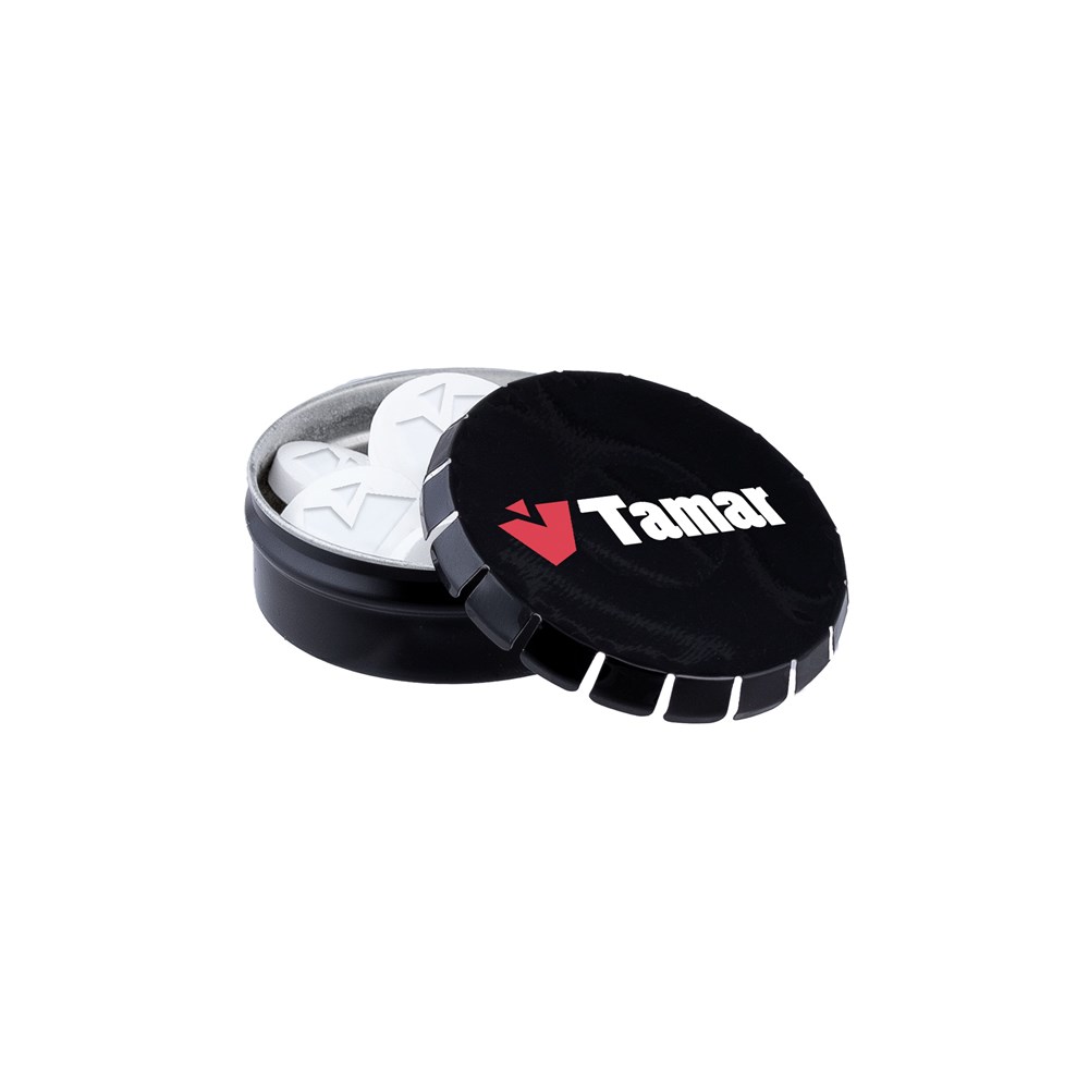 Mini clic-clac blikje zwart met ca. 23 gram logo pepermunt en voorzien van een full colour bedrukking. Inclusief ingrediëntensticker en seal.