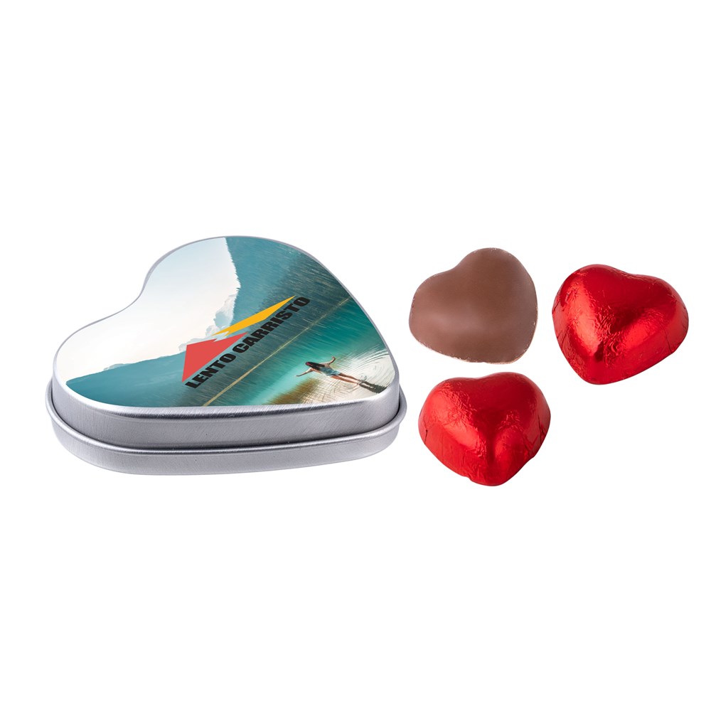 Hartenblikje zilver met 3 chocolade hartjes in rood folie en voorzien van een full colour bedrukking. Inclusief ingrediëntensticker.