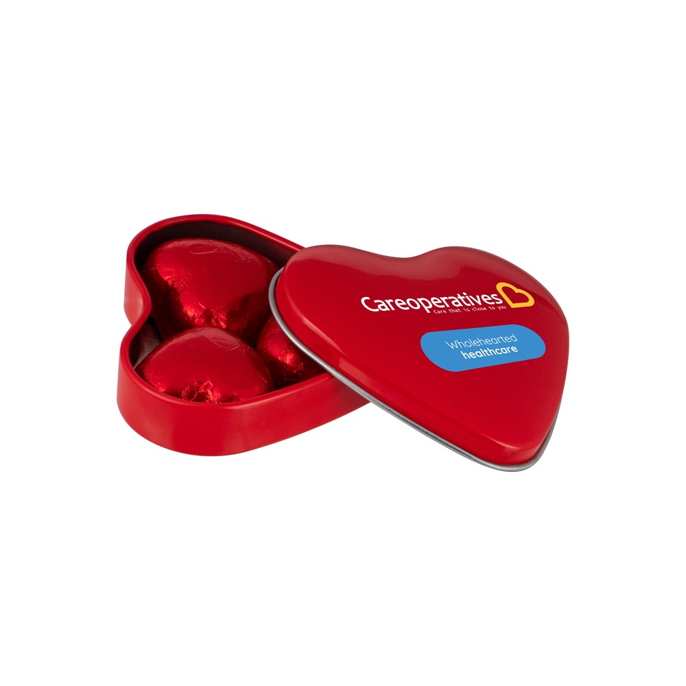 Hartenblikje rood met 3 chocolade hartjes in rood folie en voorzien van een full colour bedrukking. Inclusief ingrediëntensticker.