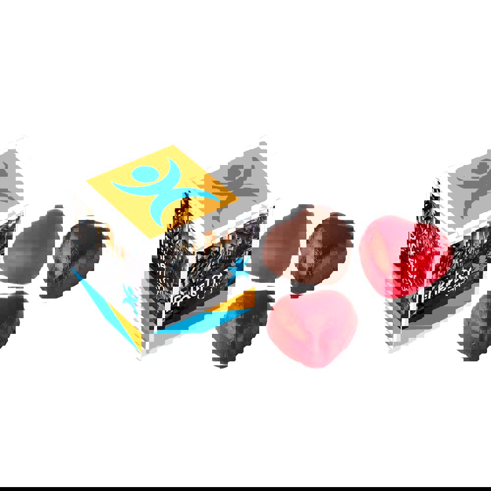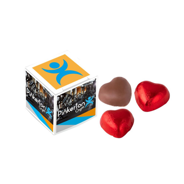 Doosje voorzien van een all-over full colour bedrukking, gevuld met 3 chocolade hartjes in rood folie
