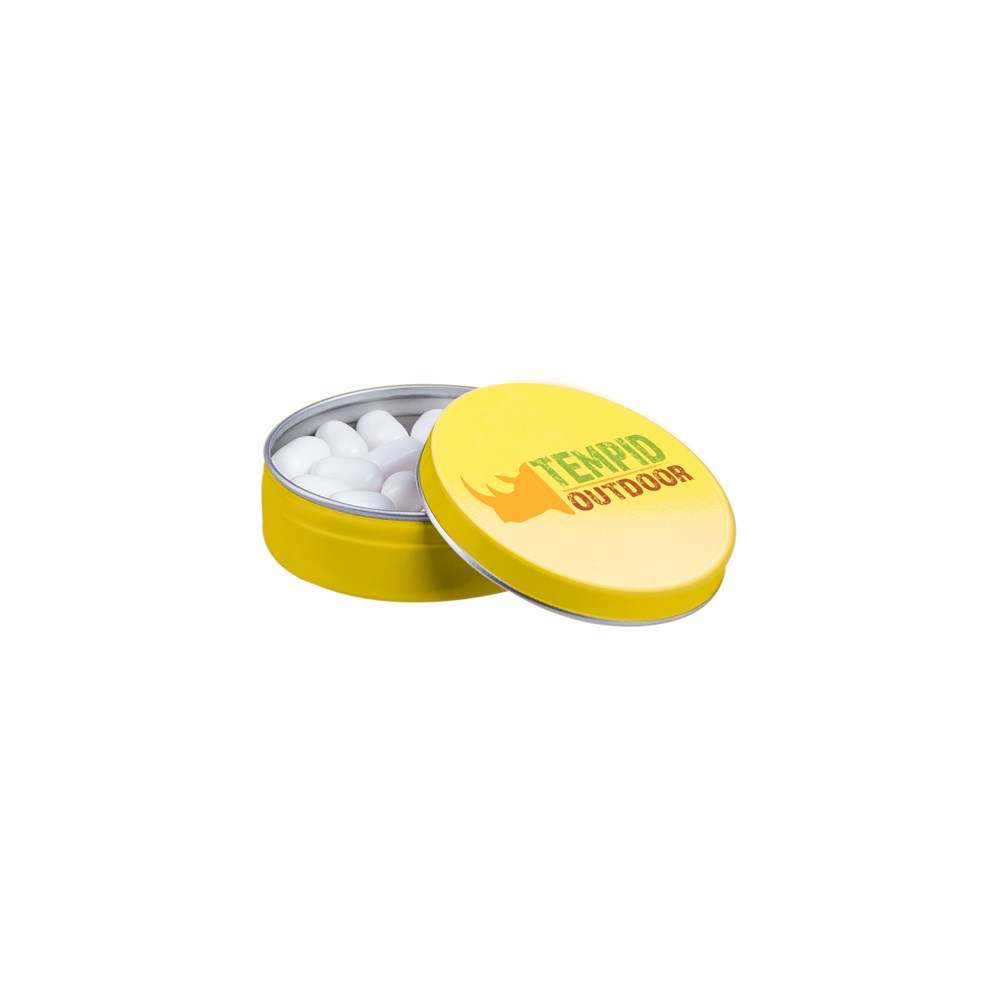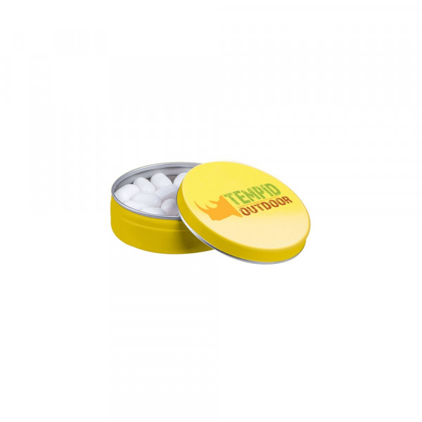 Geel blikje gevuld met ca. 18 gram Tic-Tac, voorzien van een full colour bedrukking op het deksel. Inclusief ingrediëntensticker en seal.
