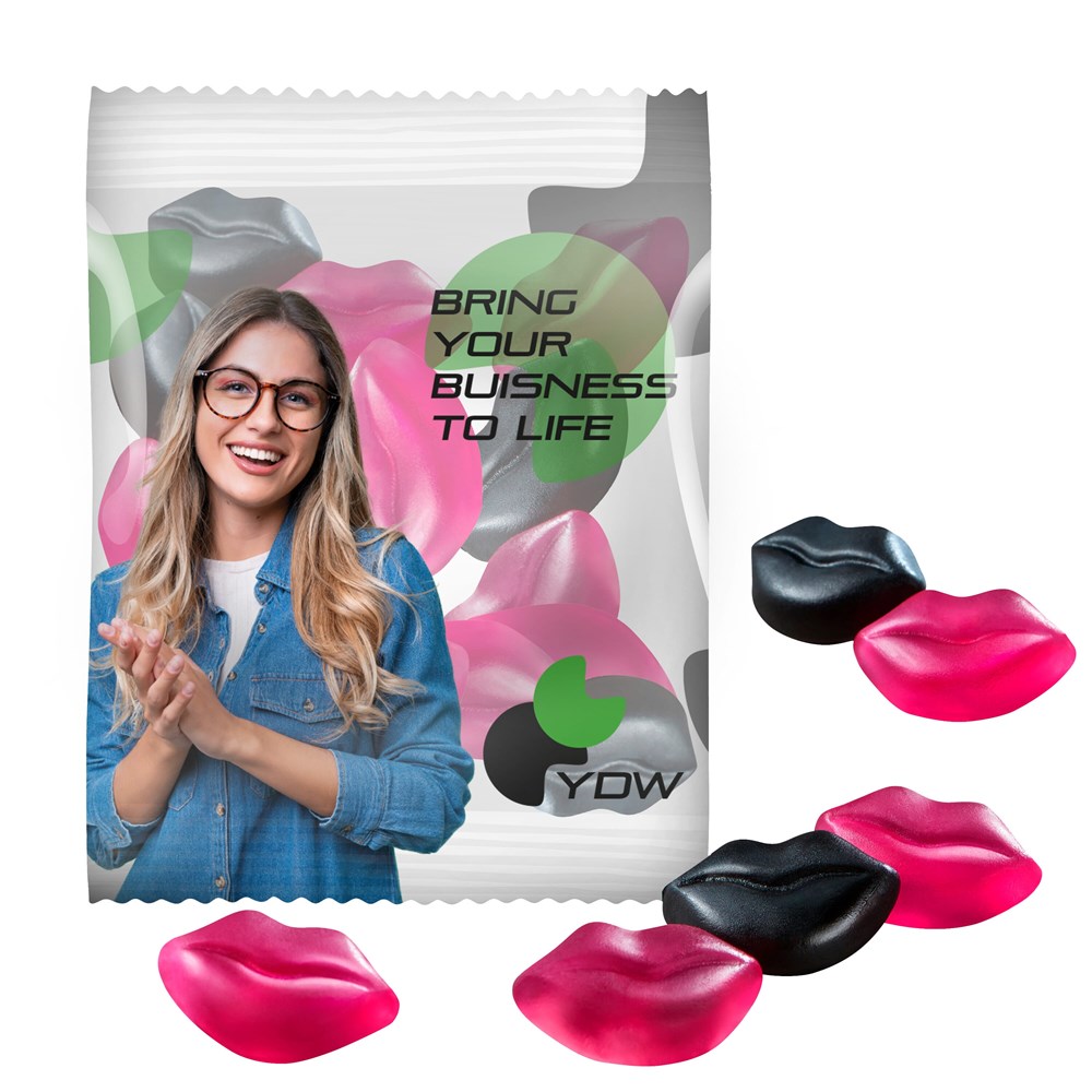 All-over full-colour bedrukt zakje, gevuld met ca. 15gr vegan Schwarzwälder-Kers vruchtengummiesplus