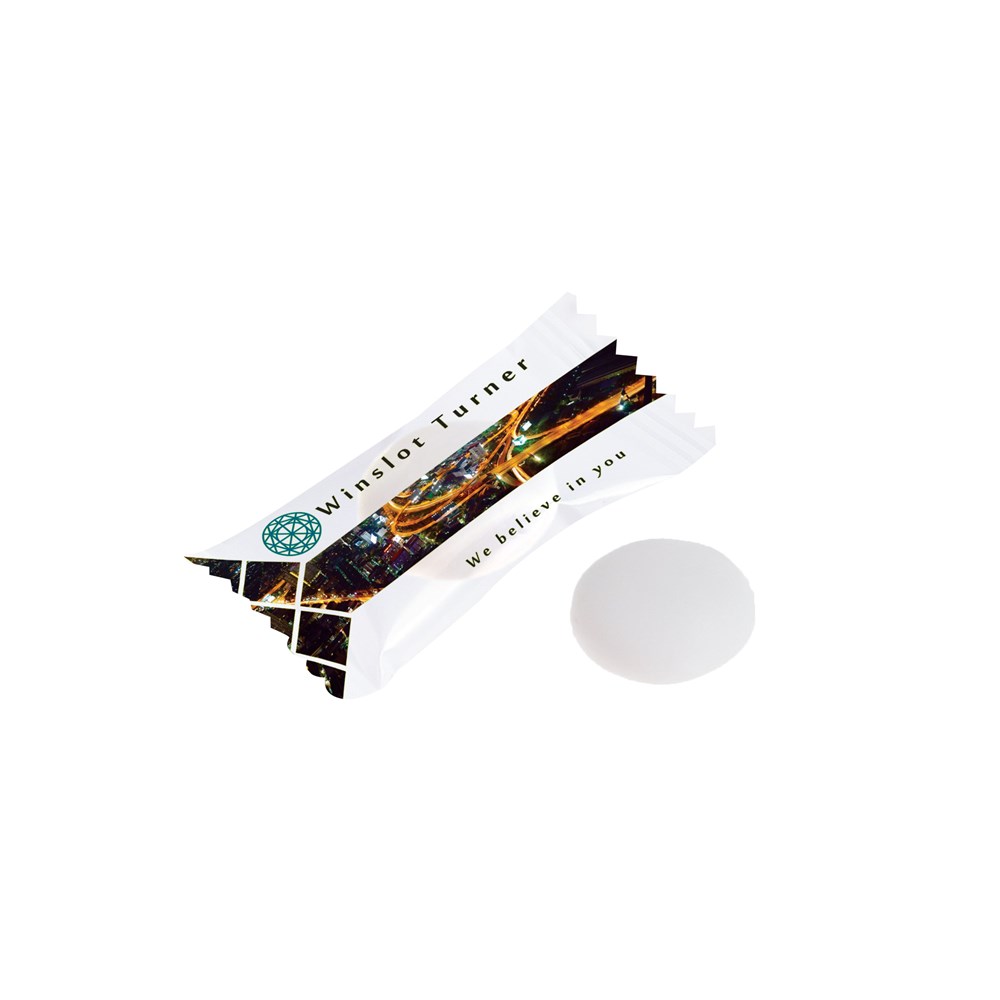 Flowpack met 1 Mentos Mint in witte folie, voorzien van een all-over full colour bedrukking.plus