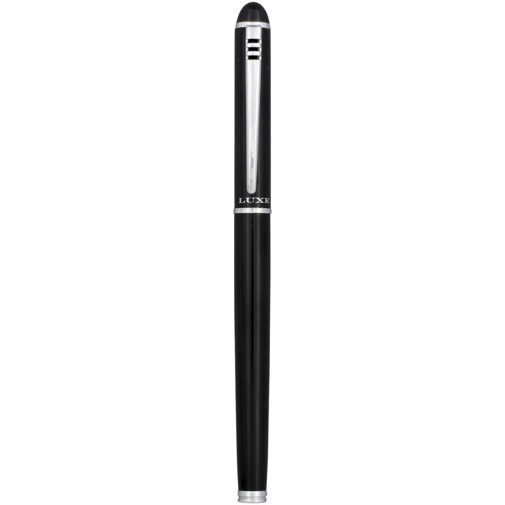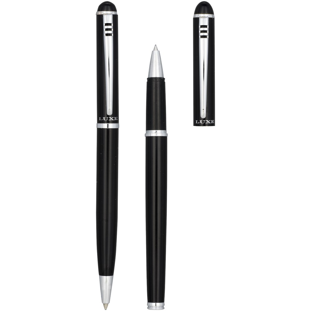 Parure stylo à bille avec mécanisme twist au design exclusif et roller. Disponible en noir brillant, argenté mat et bleu mat. Emballés dans une boîte cadeau « LUXE ».