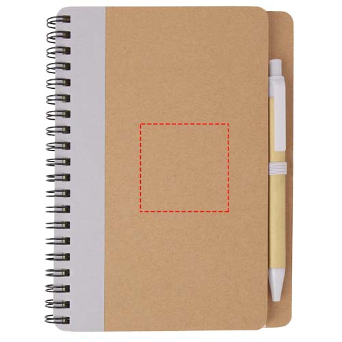 Carnet à la couverture en papier recyclé avec 60 pages format A6 en papier recyclé à lignes et son stylo assorti. Le carnet et le stylo sont emballés ensemble.