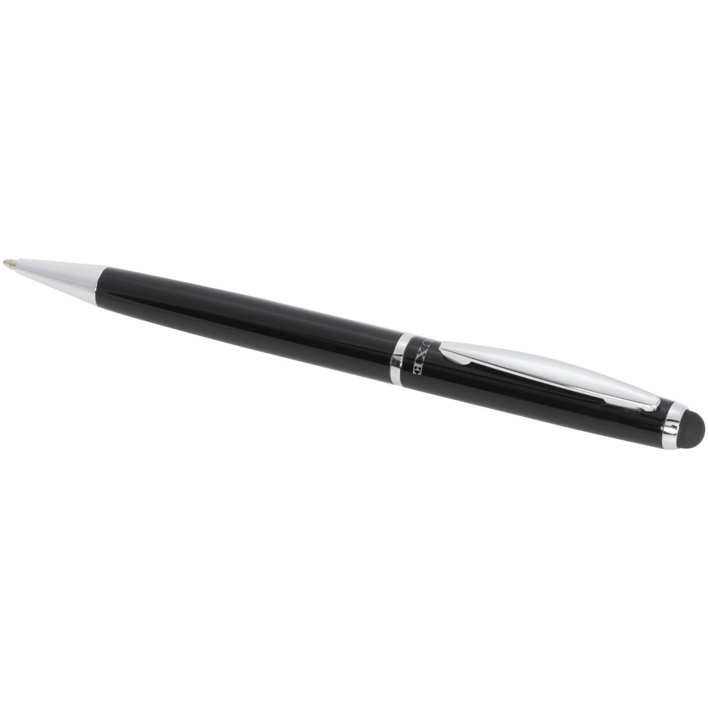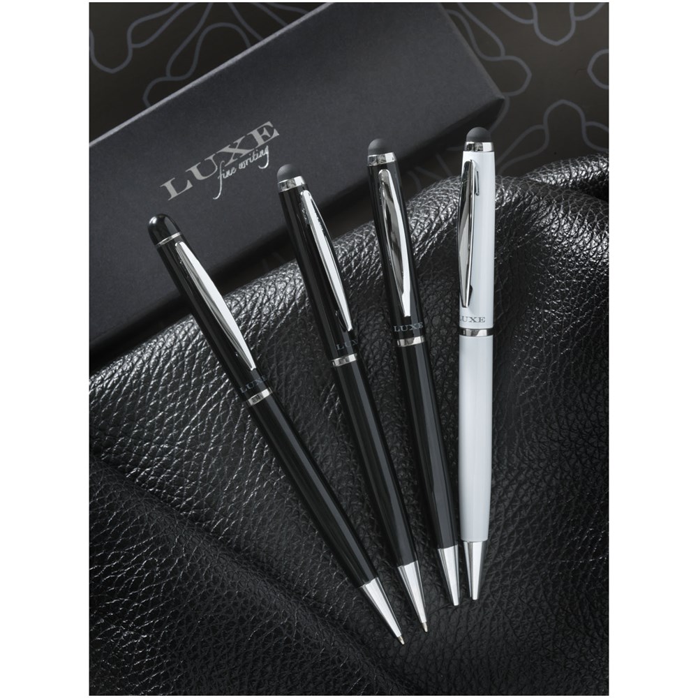 Stylo à bille stylet avec mécanisme rotatif au design exclusif et avec une pochette en velours. Emballé dans une boîte cadeau « LUXE » (dimensions : 17 x 3,5 x 2 cm).