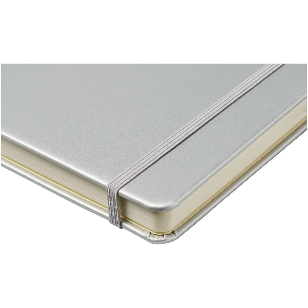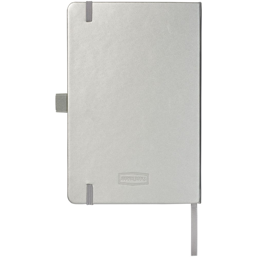 Cahier A5 (14,2 cm x 21,4 cm) en cuir PU avec élastique, ruban marque-page, boucle à stylo et poche arrière en accordéon. Comprend 96 feuilles de papier crème lignées en 80 g/m² et est livré dans une pochette blanche Journalbook.