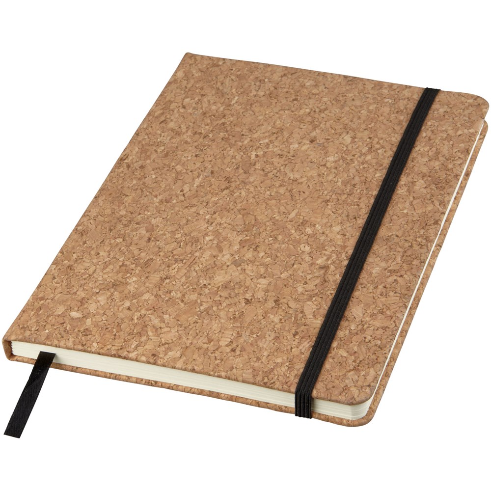 Carnet de notes de taille A5 avec couverture en liège, élastique et ruban noirs. Avec 80 feuilles de papier ligné de 70g/m².
