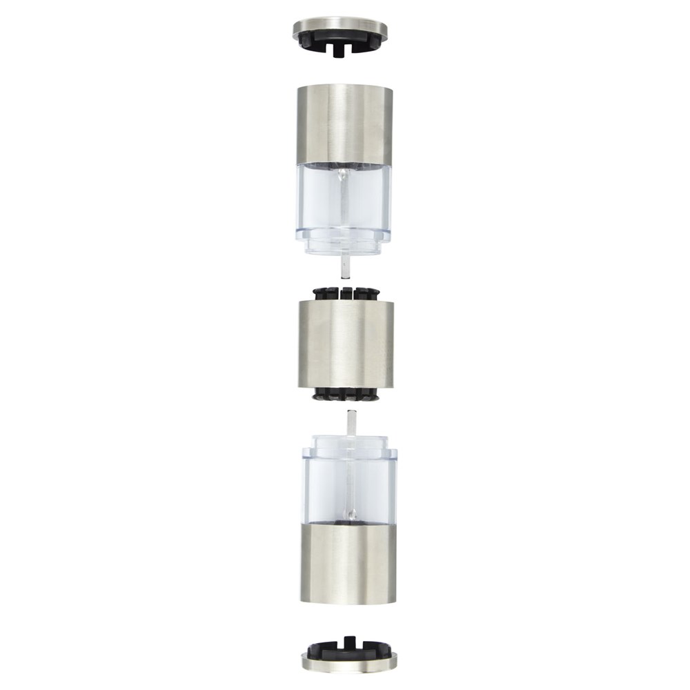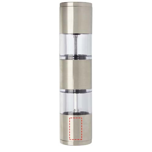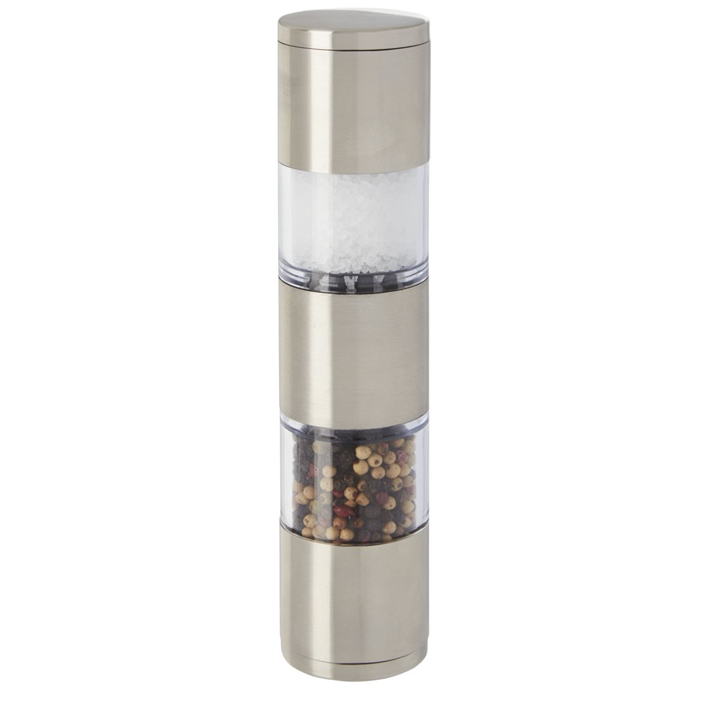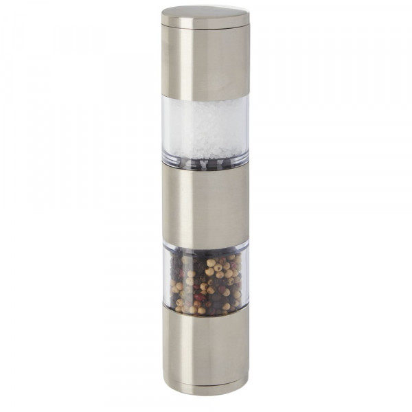 Moulin à deux côtés avec une extrémité pour le sel et l'autre pour le poivre. Le poivre et le sel ne sont pas inclus. Peut contenir 50 g de sel et 36 g de poivre. Capacité : 80 ml.