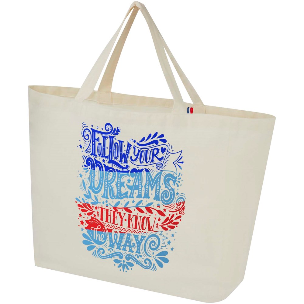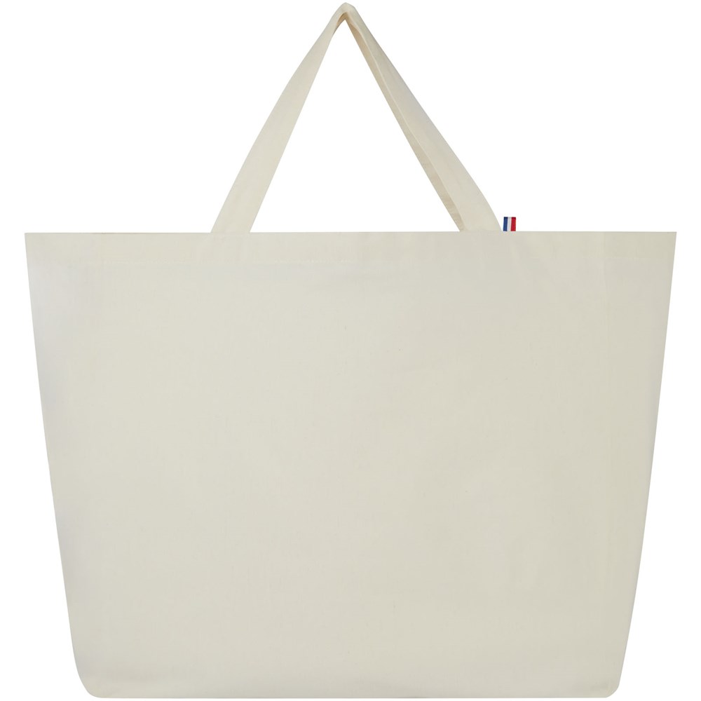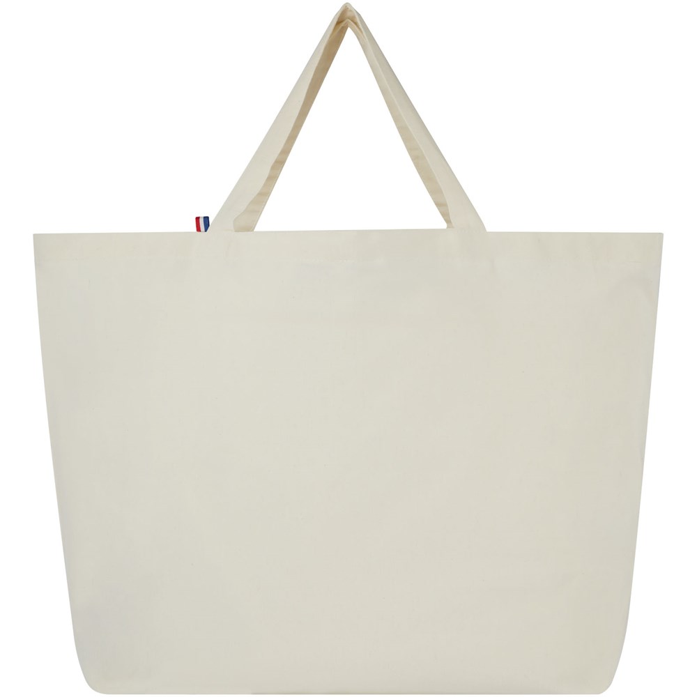 Ce sac shopping de grande capacité est fabriqué à partir des meilleurs matériaux 100 % recyclés. Il est conçu pour être utilisé dans la vie de tous les jours et convient pour transporter des livres lourds ou des provisions. Le mélange coton/polyester recyclé de 200 g/m² garantit la durabilité et la fiabilité du sac, qui résiste à un poids de 14 kg. Les fils proviennent d'Asie, mais le tissage, la filature et la fabrication sont réalisés en France.