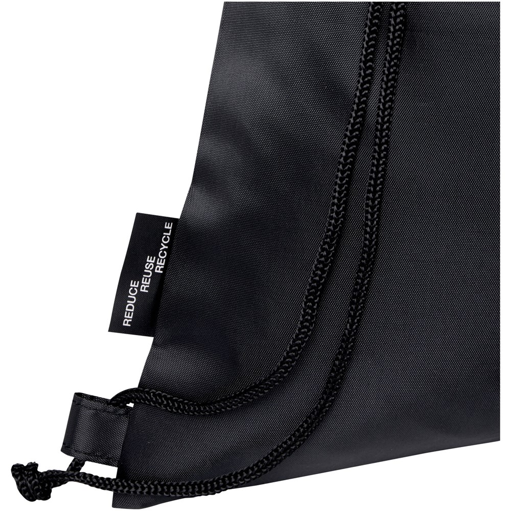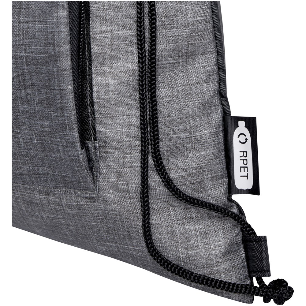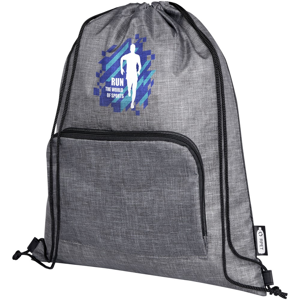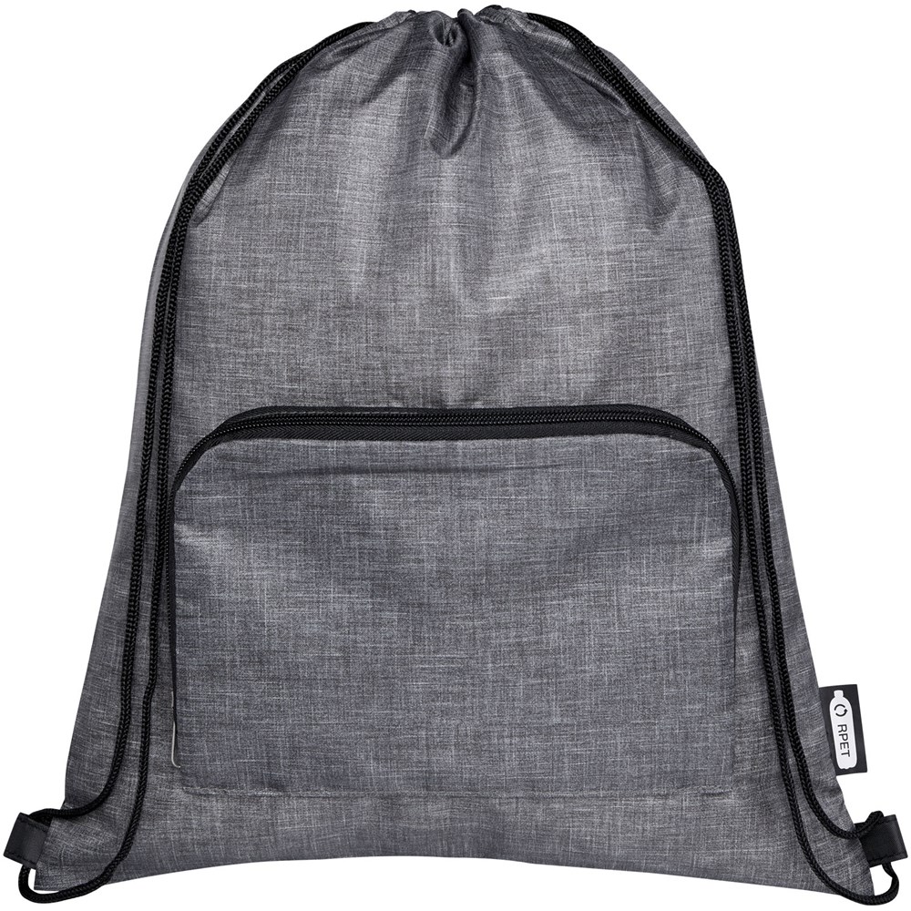 Le sac pliable recyclé Ash avec cordon de serrage dispose d'un compartiment principal avec fermeture à cordon et d'une poche frontale zippée dans laquelle le sac peut facilement se replier pour un transport et un rangement faciles.