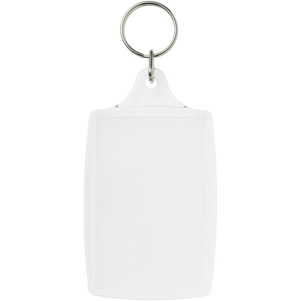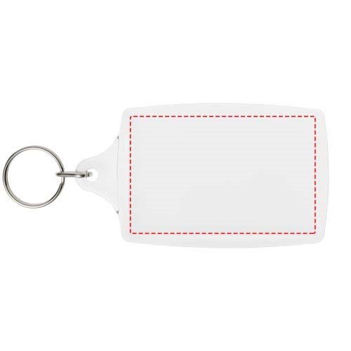Porte-clés transparent L4 avec anneau fendu en métal. L’anneau en forme de boucle métallique présente un profil plat idéal pour les envois. Dimensions de l’insert pour impression : 7 cm x 4,5 cm.