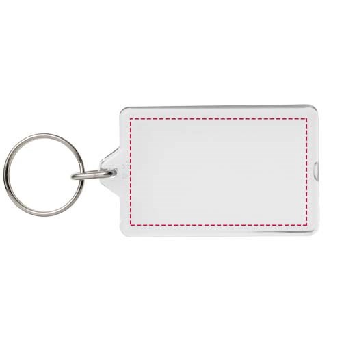 Porte-clés transparent G1 rectangulaire avec anneau fendu en métal. Ce porte-clés s’ouvre à nouveau avec une pièce de monnaie. L’anneau en forme de boucle métallique présente un profil plat idéal pour les envois. Dimensions de l’insert pour impression : 5,0 cm x 3,0 cm.