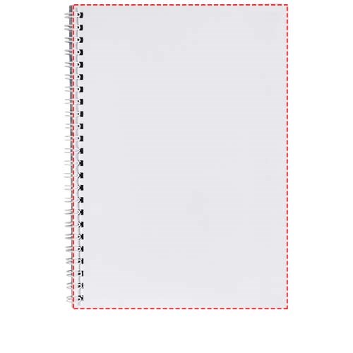 Ce carnet de notes A4 comprend des spirales blanches ou noires, du papier vierge de 80 g/m2 et une couverture avant et arrière en carton brillant (250 g/m2). Le modèle standard est livré avec 50 feuilles, mais le carnet de notes est également disponible avec 80 feuilles. L'impression est possible sur les feuilles ainsi que sur les couvertures recto et verso.