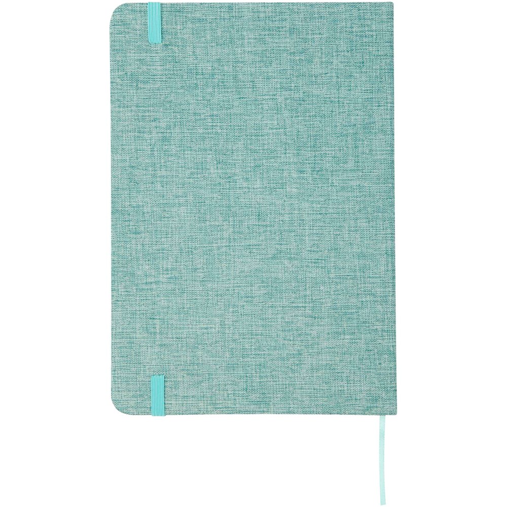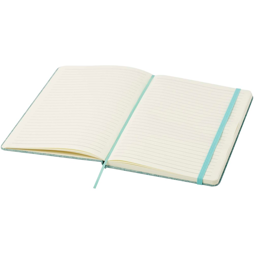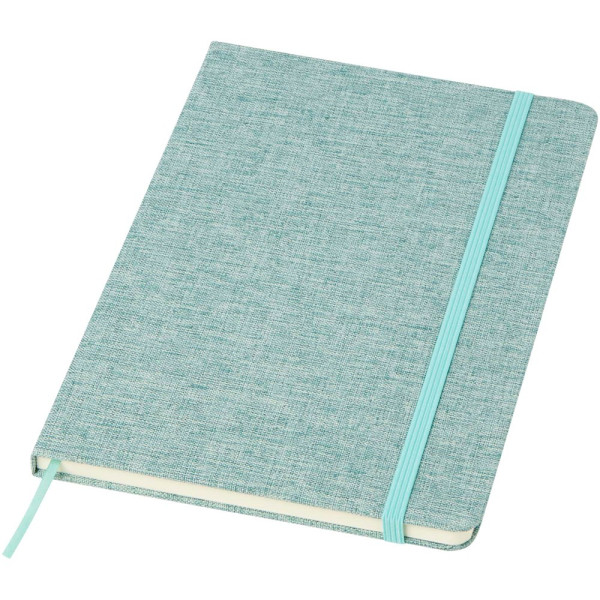 Carnet A5 à couverture rigide en coton recyclé avec 80 feuilles lignées en papier 70 g/m². Le carnet est doté d'une fermeture élastique, d'un ruban et de coins arrondis.