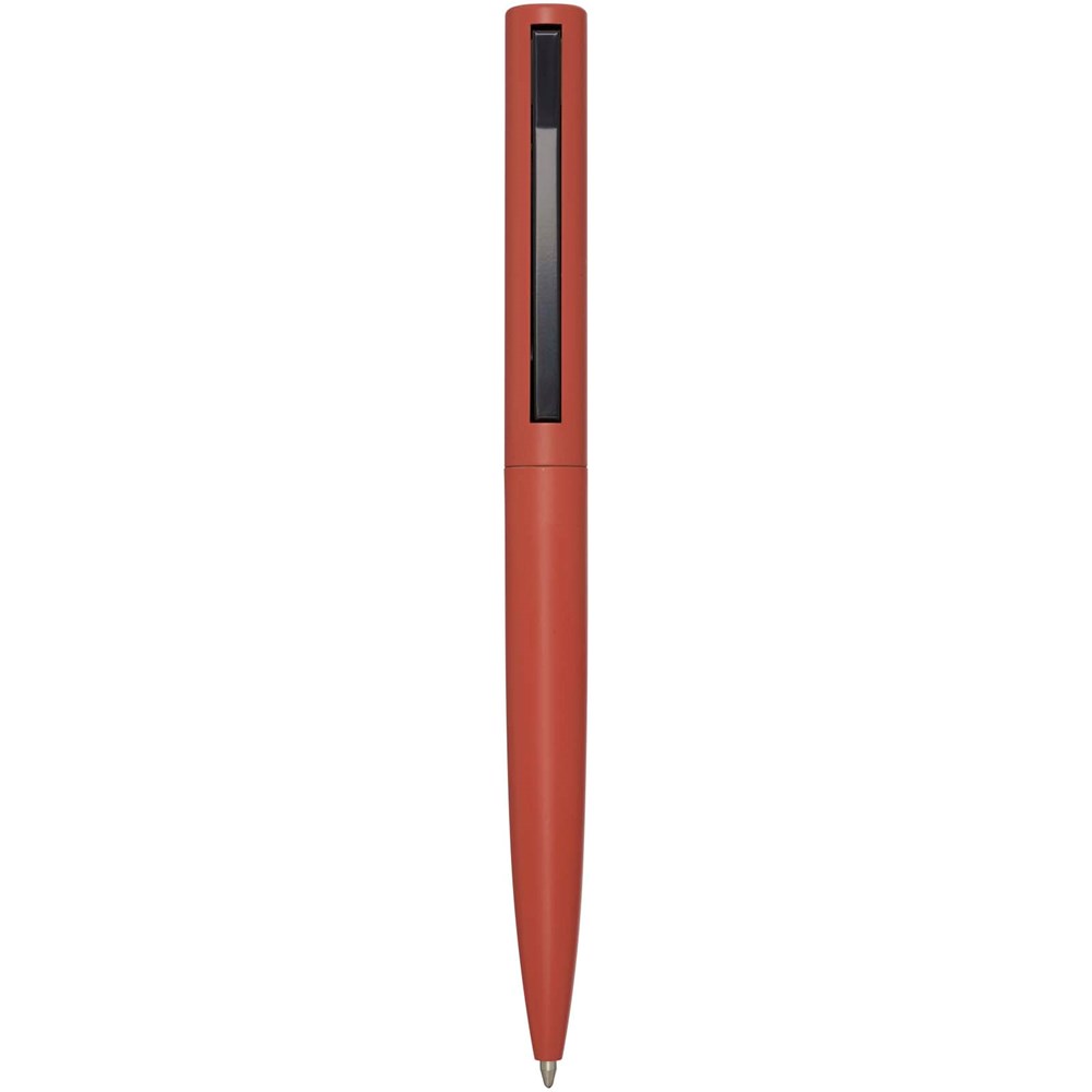 Stylo bille dont le corps supérieur est en plastique recyclé et la partie inférieure en aluminium recyclé. Le stylo est muni d'un clip métallique à ressort qui permet de l'accrocher à des objets plus épais tels que des sacs ou des cahiers. Le clip se referme avec un clic audible. Couleur de l'encre : Bleue. Longueur d'écriture : 1 000 mètres. Taille de la pointe : 1 mm.